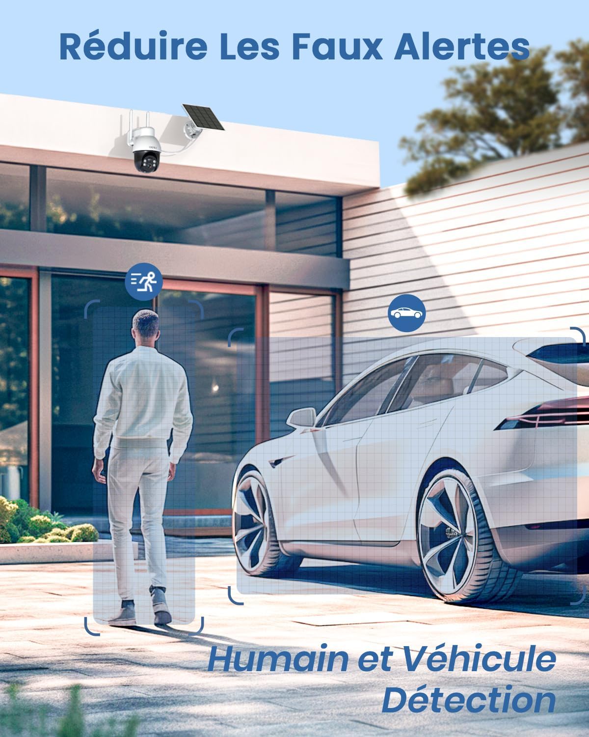 - Vision Nocturne Couleur: La caméra de surveillance extérieure sans fil à énergie solaire est équipée d'une fonction d'analyse AI intelligente des formes humaines, équipé d'un projecteur intelligent et d'alarmes puissantes pour dissuader les visiteurs indésirables et offrir une couche supplémentaire de sécurité.